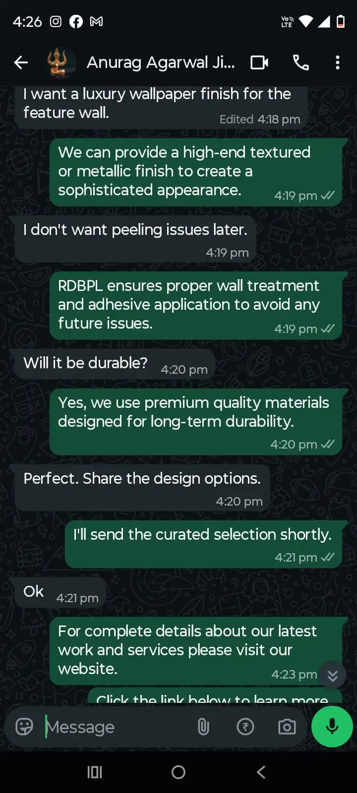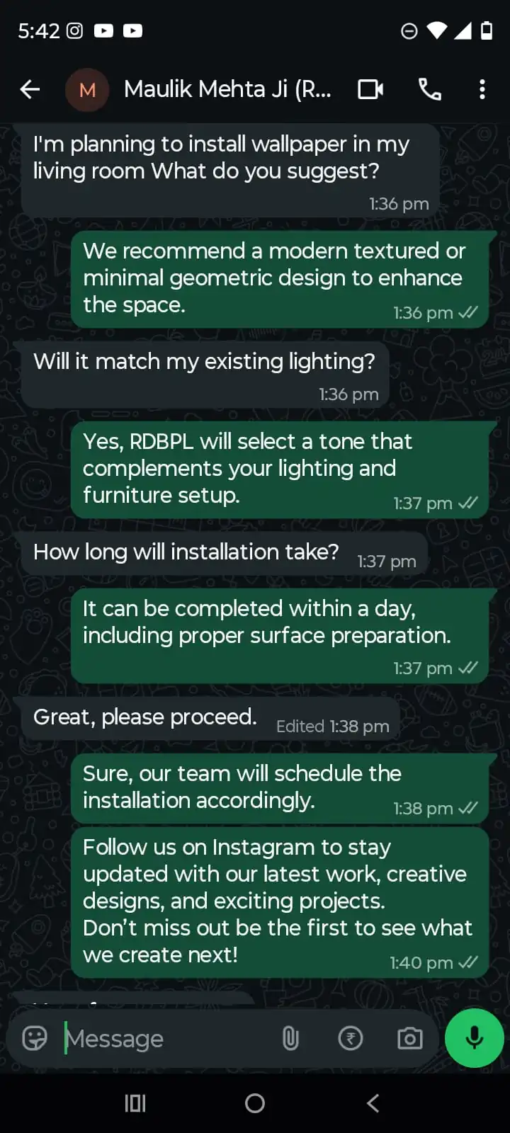 “RDBPL team installed designer wallpaper in our living room perfectly. The finishing is smooth, elegant and completely transformed our space. Highly recommended for modern interiors in Lucknow.”